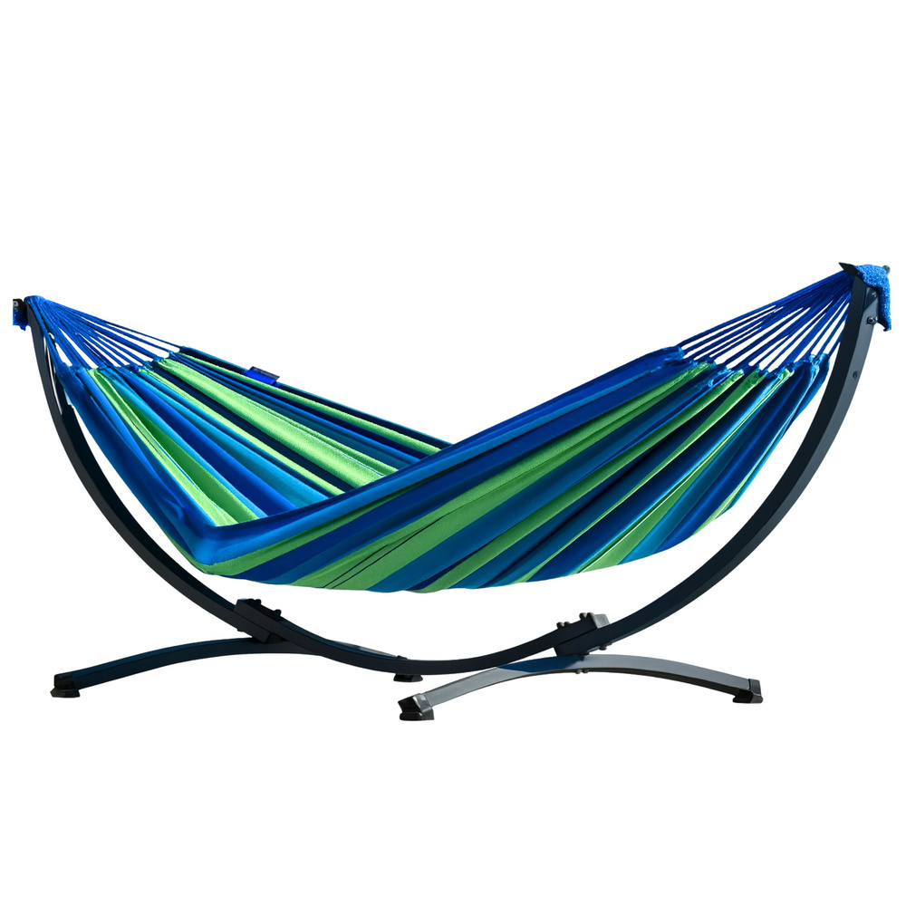 - This complete hammock set consists of a sturdy steel frame and a large, comfortable green-and-blue hammock. It's an excellent choice for anyone who appreciates comfortable relaxation in the garden, on the terrace, or balcony.