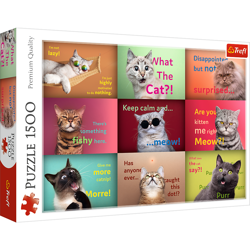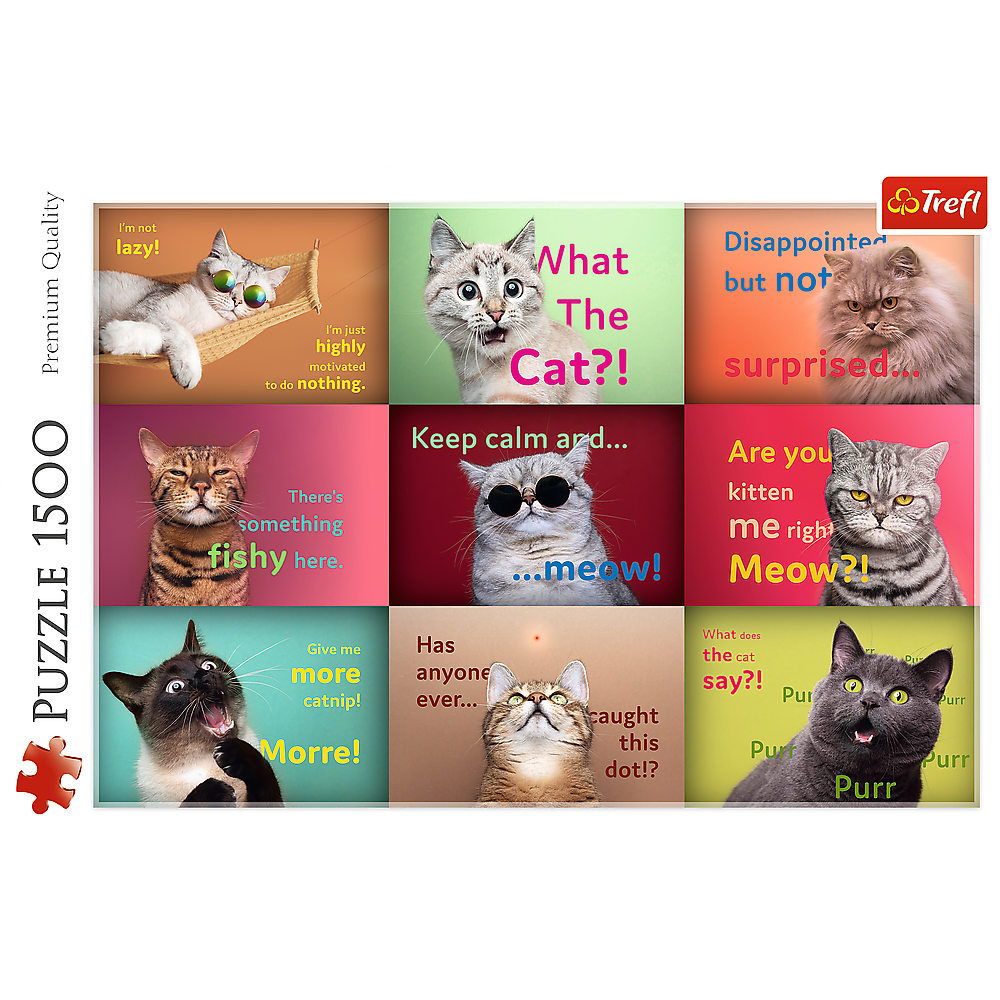 The Funny Cat Portraits puzzle consists of 1500 pieces and features funny cat memes. Once assembled, the puzzle will create a picture measuring 850 x 580 mm.