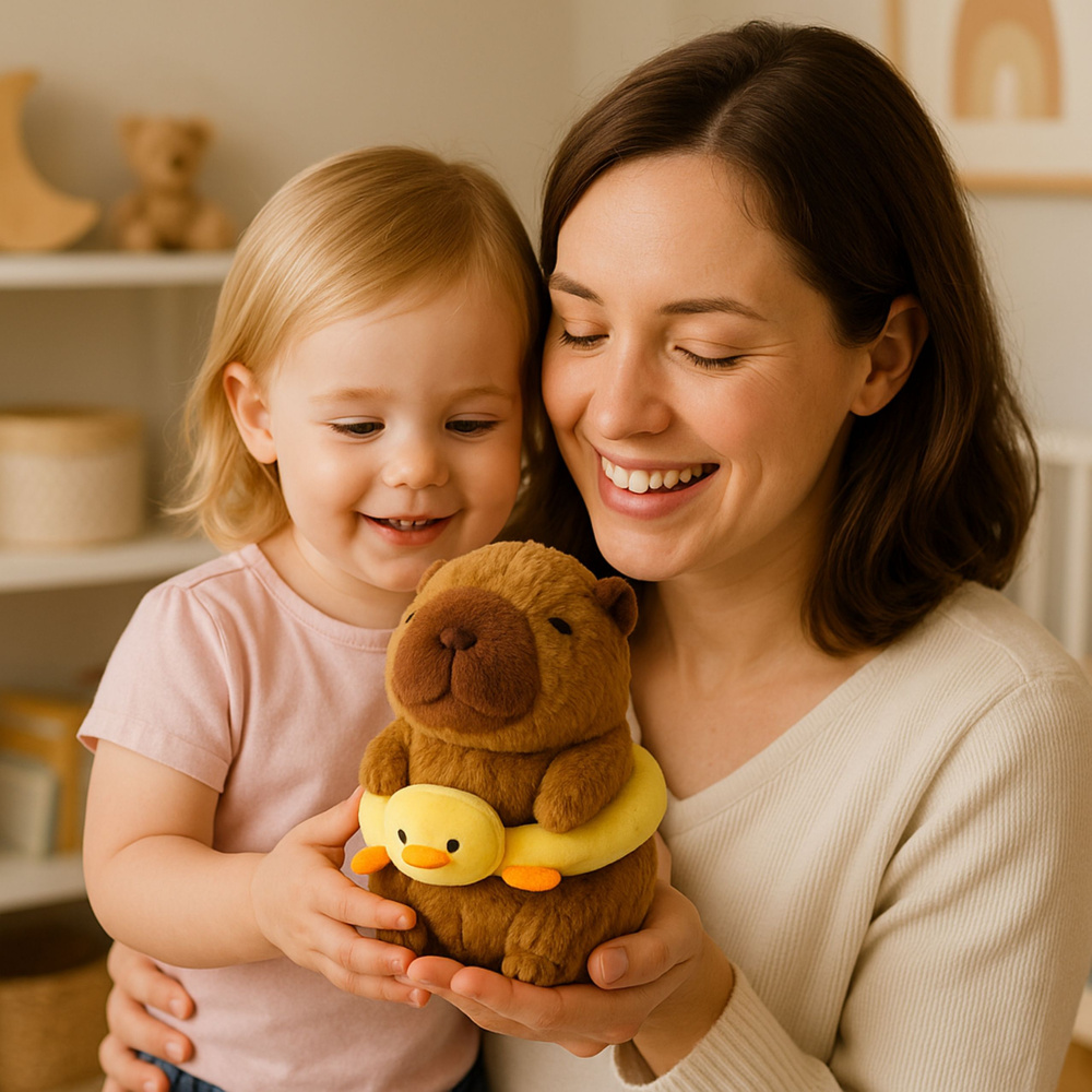 - This plush capybara with a charming duck lifebuoy is a unique plush toy that combines softness, charm, and playfulness. It's made of soft, cuddly plush, ensuring comfort while cuddling.