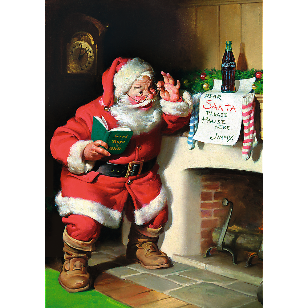 The Coca-Cola: Santa by the Fireplace Christmas puzzle consists of 1000 pieces and features Santa Claus with a classic Coca-Cola bottle. Once completed, the puzzle forms an image measuring 683 x 480 mm.