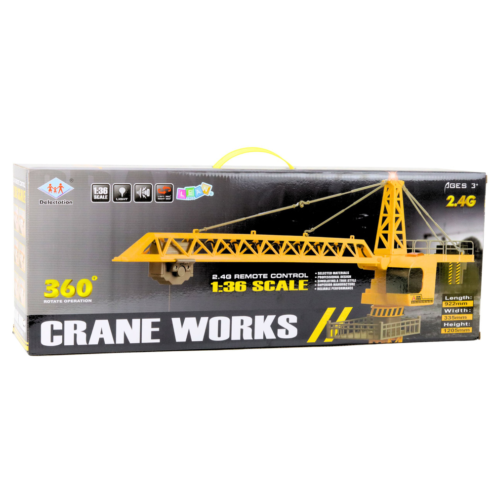 - This realistic 2.4GHz remote-controlled construction crane is a unique toy for every young builder and construction machinery enthusiast. Built in 1:36 scale, it impresses with its height of over 120 cm, realistic appearance, and rich functionality.