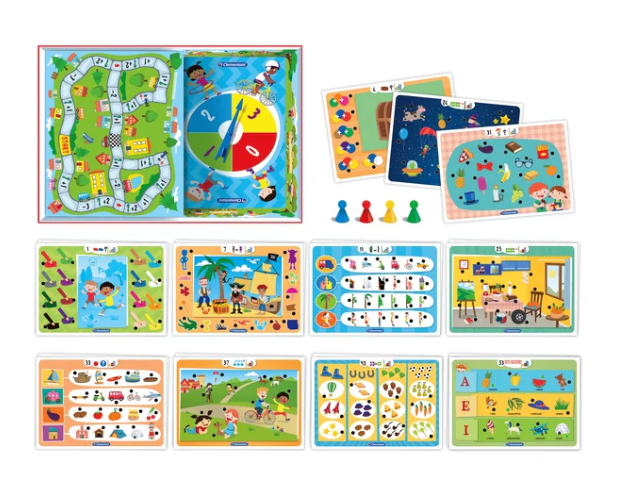 An educational set that includes 32 activity cards and 64 exercises, helping children discover letters, words, numbers, sizes, shapes, and colors.