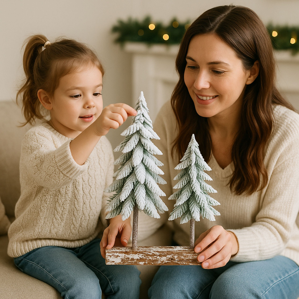 This decorative arrangement of two Christmas trees is a striking decoration that perfectly brings a winter atmosphere and subtle, natural elegance to any interior. The trees are made of high-quality material imitating pine needles, and each is covered with a white finish resembling snow, giving the whole arrangement a realistic, wintery look. Both trees sit on a common base made of natural wood, styled to emphasize the rustic, festive character of the decoration.
