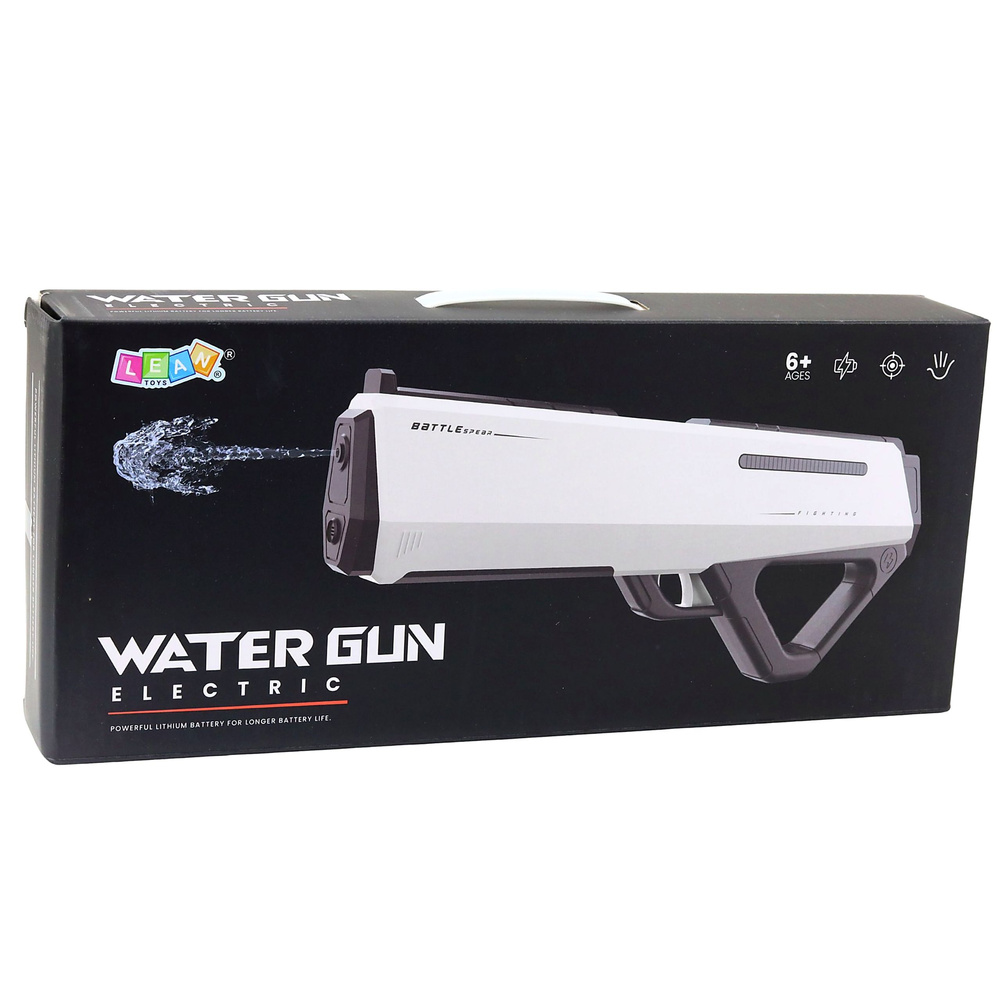 - The Battle Pro electric water gun is a modern toy designed for intense, dynamic outdoor play. It features a futuristic, minimalist design in black and white.