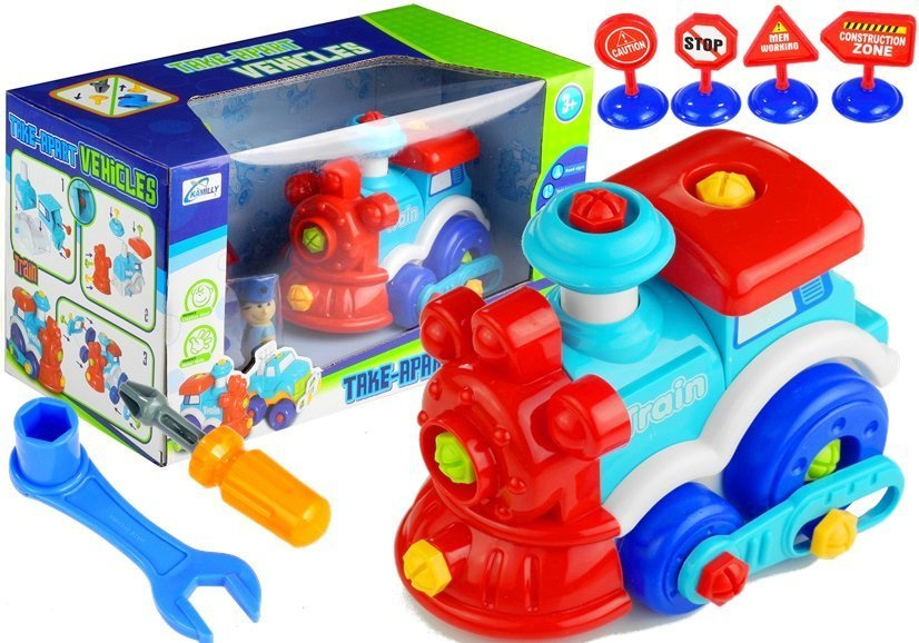 The train has movable wheels so your child can play with it on the floor, carpet or other surfaces. What is important, the set includes not only the train but also figurines making play more interesting and plastic tools. An adjustable spanner and a screwdriver with a replaceable tip are perfectly matched to the dimensions of the plastic screws by which the wheels or bumpers of the toy are attached. It is worth noting a number of possibilities of this solution. From now on, the toy is not an integral whole - the child may disassemble it and play with it according to its own rules.