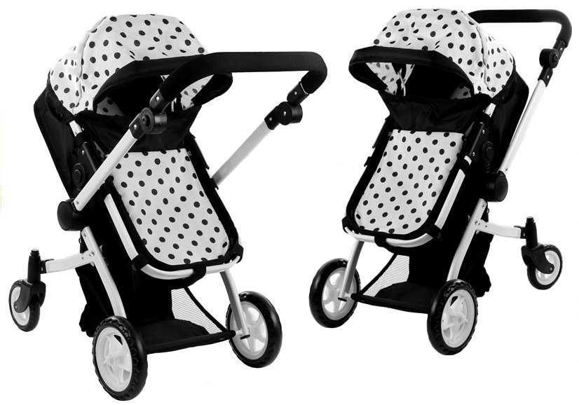 Wózek 2 w 1 przyciąga wzrok wszystkich dziewczynek swą konstrukcją, przypominającą budowę prawdziwego wózka, a także klasyczną kolorystyką, przełamaną dziecięcym motywem w urocze groszki. To także rewelacyjny przedmiot dla kilkulatek, które lubią opiekować się zabawkowymi bobasami w różnych rozmiarach — od teraz mogą wyprowadzać swe lalki na spacer zarówno w spacerówce, jak i klasycznym wózku z gondolą. Zmiana tych wariantów jest bardzo prosta — wymaga zaledwie kilku ruchów, a w dużym stopniu urozmaica zabawę. Kolejną, dużą zaletą innowacyjnej konstrukcji wózka dla lalek jest zamontowanie dwóch kół stałych oraz dwóch mniejszych, obrotowych o 360 stopni kółek, które sprawiają, że prowadzenie wózka i manewrowanie nim na drodze jest bardzo lekkie i niewymagające siły.