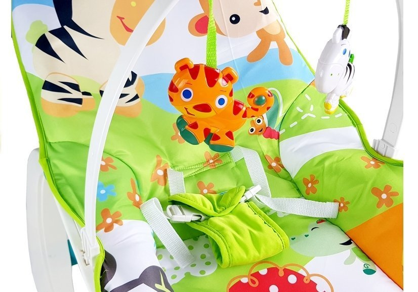 The rocker is powered by 3 AA 1.5V batteries, which are not included in the set. The seat has a CE certificate, which combined with the highest quality materials, guarantees solidity and reliability of the product. A rocker for a baby is packed in an aesthetic, colorful box with a handle for easy carrying.