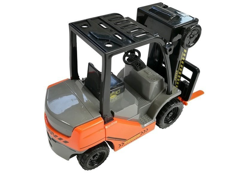 The Toy Forklift Truck is maintained in a construction colour scheme - orange and black colours are automatically associated with a construction vehicle. Looking at the toy truck, what is definitely striking is the protective structure designed to shield the forklift operator and the large forks placed at the front of the vehicle. Despite its small size, the Toy Forklift has a lot of detail, which further enhances the play experience. The dashboard features a steering wheel and many gouges to simulate the indicators found here on a full-size forklift.