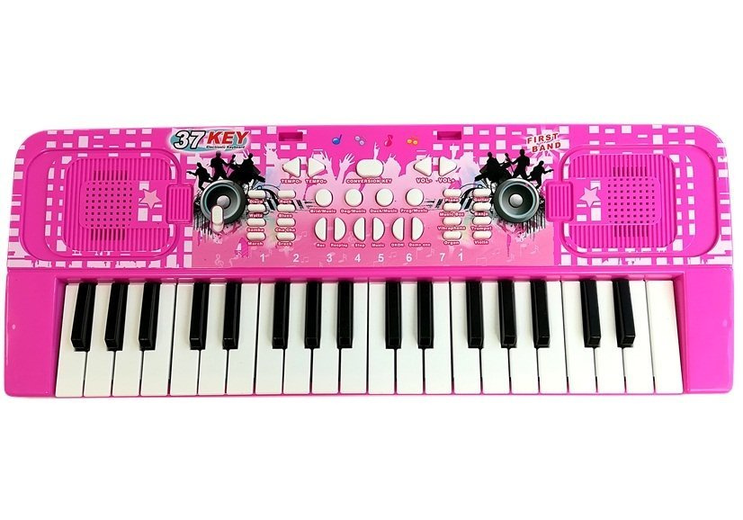 - Educational pink keyboard with a microphone, perfect for little musicians. 37 keys for learning how to play and the possibility of vocal performances. With recording and experimenting with sounds. Inspiring fun.