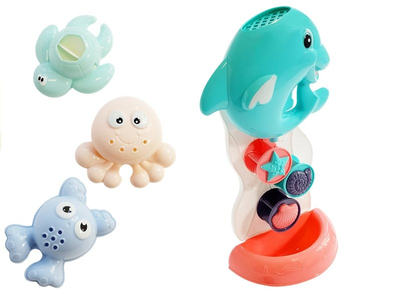 The dolphin works like a waterfall, it is enough to fill it with water from above and the water flowing from the top will set the wheels with shells in motion, which will attract the child's attention. Additionally, 3 sea animals are included that float on the surface of the water and swim around your baby, making him smile.