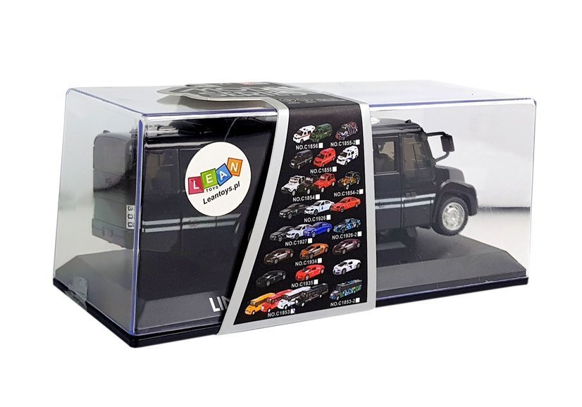 The box it is packed in will look nice on the shelf. The bus has a pull-back drive and is made of plastic with rubber tires. The interior of the car is reproduced with every detail that will resemble a real counterpart. On the sides of the black car there is a white inscription POLICE and characteristic stickers. The toy will awaken your child's great curiosity and one of these cars will certainly join his collection.