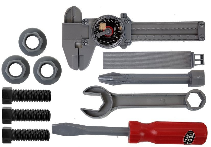 Ten wspaniały zestaw zawiera świetnie wykonane i dopracowane narzędzia w całości wykonane z plastiku. Dzięki walizce, w którą są spakowane narzędzia zawsze po skończonej pracy będzie można schować na swoim miejscu. Każdy mały majsterkowicz powinien mieć takie narzędzia aby zostać pomocnikiem taty, dziadka i w razie awarii szybko usunąć usterkę. Zestaw sprawi niejednemu małemu pomocnikowi niesamowitą frajdę podczas zabawy przy majsterkowaniu. Wiertarka po naciśnięciu przycisku zaczyna się kręcić.
