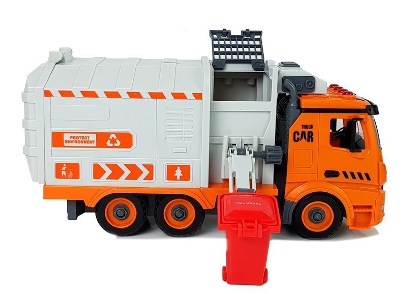 Pomarańczowo-szara śmieciarka zapewni wszystkim chłopcom długie godziny wypełnione rewelacyjną zabawą. Ta niebanalna zabawa będzie rewelacyjnym uzupełnieniem kolekcji pojazdów, a także zabawką, która szybko się nie znudzi. Pojazd utrzymany jest w klasycznej, pomarańczowej kolorystyce, z czarnymi i szarymi detalami. Śmieciarka osadzona jest na bieżnikowanych kołach, dzięki czemu dziecko będzie mogło używać jej na różnych rodzajach powierzchni. Autko może pokonywać prostą drogę, wystarczy tylko napędzić je, popychając.
