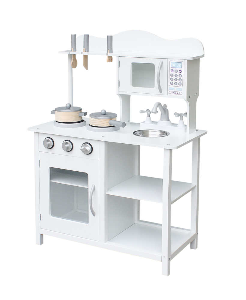 The kitchen has many knobs and doors, which will allow a few-year-olds to develop their motor skills and the reflex to grab objects of various shapes. The entire kitchen is white with gray knobs and handles. The tabletop is white, there is a sink and burners on which you can cook wonderful dishes. A microwave oven with an opening door and two knobs is mounted above the sink. The shelves underneath and a cupboard with opening doors will allow you to keep order and store pots and food products. The whole set includes great elements, thanks to which you can prepare breakfast. It will fit perfectly into any interior, especially in a children's room.
