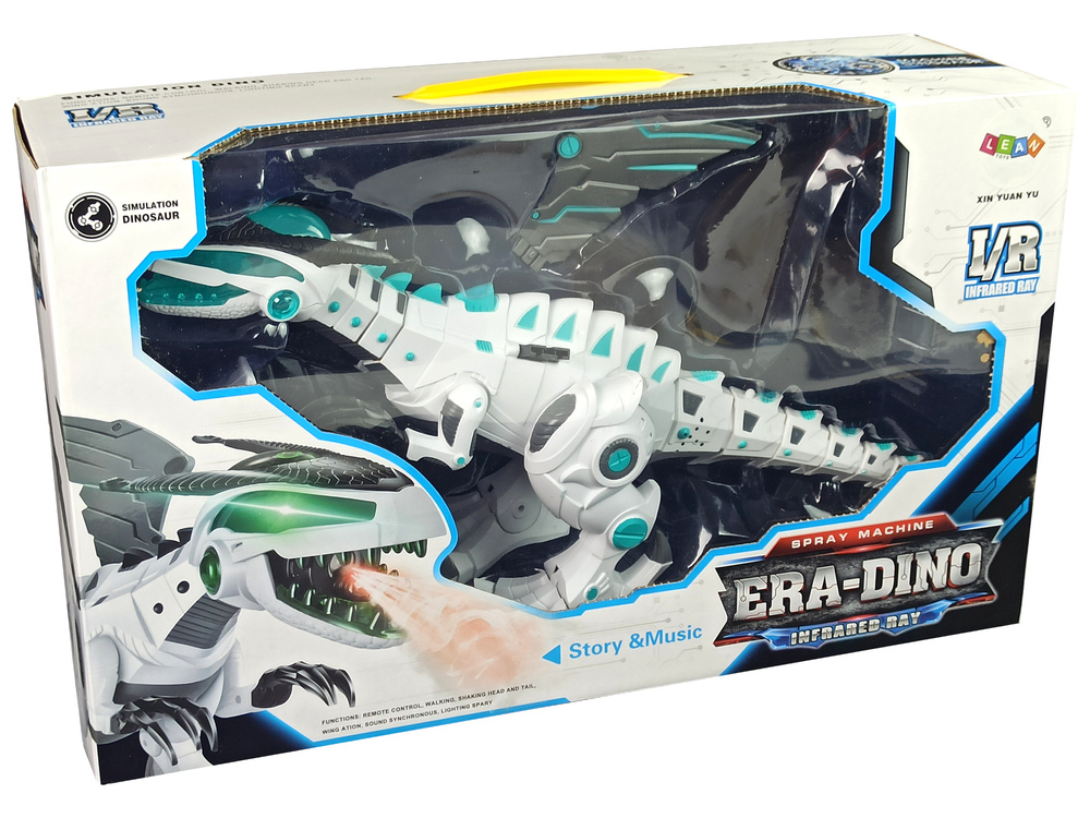 The toy is made of certified material, which is plastic resistant to frequent use. The dinosaur is powered by three 1.5 V AA batteries (not supplied), and the remote control by two 1.5 V AA batteries (not supplied). Suitable for children over 3 years of age. Despite the menacing appearance, the toy is free of sharp and dangerous for children elements or ends.