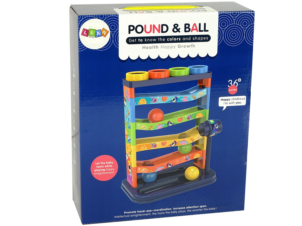 You have to put the balls into the hole located in the first platform and then let them freely climb the floors and fall down. Use a hammer to make the ball fall in, exercising distance judgement, precision and eye-hand coordination. Each hole has a different colour, just like the balls, you can try to match the correct colours, which will exercise your toddler's perceptive and visual functions. The balls make sounds like rattles when moving, which will capture your toddler's attention.