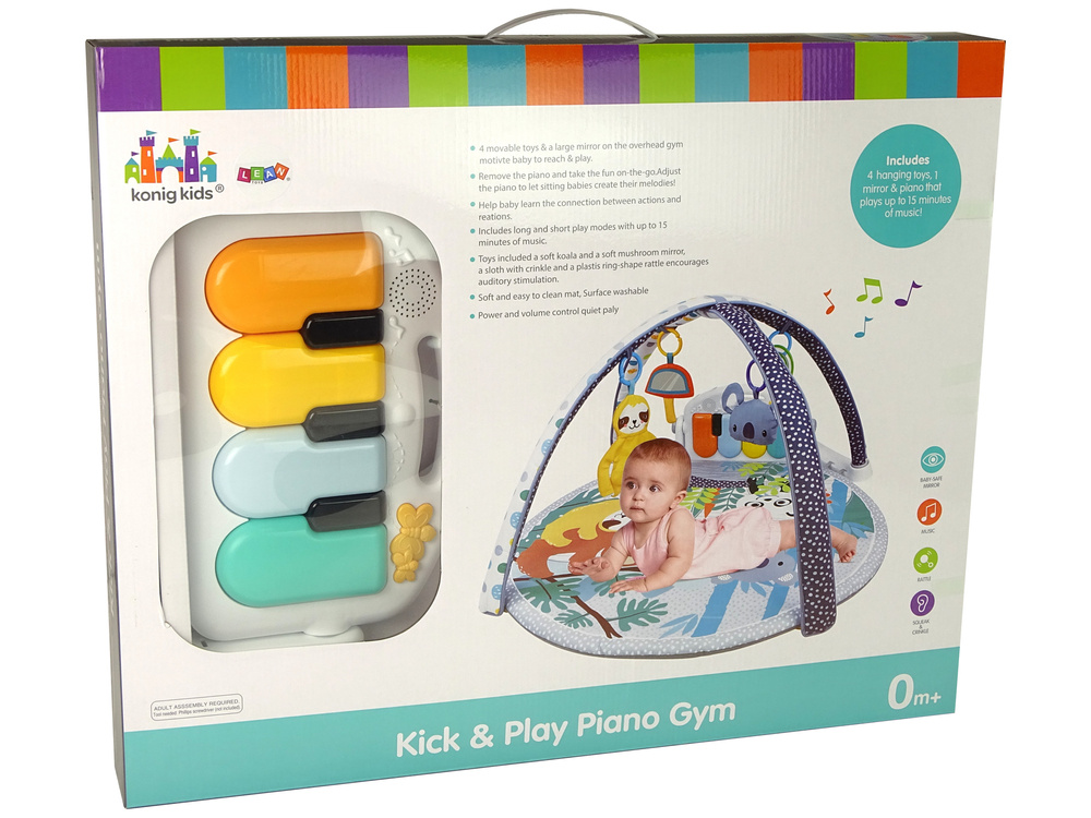Die bunte, weiche Matte wird schnell zum Lieblingsplatz Ihres Babys. Sie ist mit einem Klavier kombiniert, mit dem Sie Ihr Kind ermutigen können, die Welt der Musik zu entdecken. Die bunten Tasten leuchten und erzeugen beim Drücken einen von vier Tönen aus einer Reihe. Das Spielzeug funktioniert aber nicht nur als Instrument: Wenn man die Taste mit dem Mikrofon drückt, wird der Musikmodus aktiviert. Wenn du die Tasten drückst, ertönt Musik aus dem Lautsprecher. Über der Matte befindet sich ein Stirnband, an dem Tier- und Rasselanhänger befestigt sind, sowie eine reflektierende Platte, die als Spiegel dient.