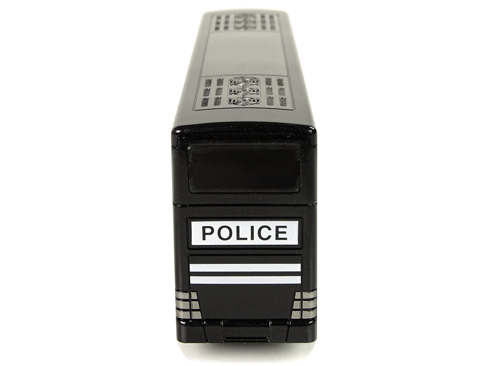 Die Schachtel, in der er verpackt ist, wird im Regal gut aussehen. Der Bus hat einen Rückfahrantrieb und ist aus Kunststoff mit Gummireifen. Das Innere des Wagens ist bis ins kleinste Detail nachgebildet, so dass er seinem realen Vorbild sehr ähnlich sieht. An den Seiten des schwarzen Autos befinden sich weiße Muster, die Aufschrift POLICE und charakteristische Aufkleber. Das Spielzeug wird bei Ihrem Kind große Neugierde wecken und sicher wird eines dieser Autos in seine Sammlung aufgenommen.