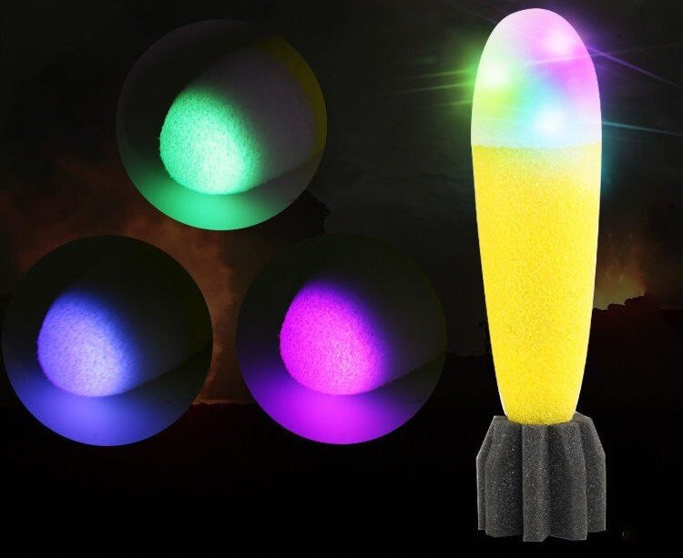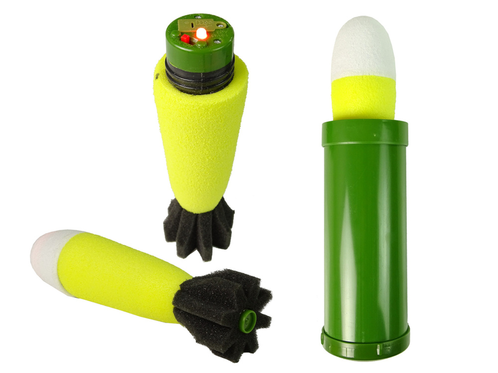 Die Kugeln sind vollkommen sicher und von weichem Schaumstoff umgeben. Durch Abschrauben des oberen Teils des Geschosskopfes können Sie die Lichteffekte aktivieren. Ein großer Effekt gibt die Reichweite des Schusses an!