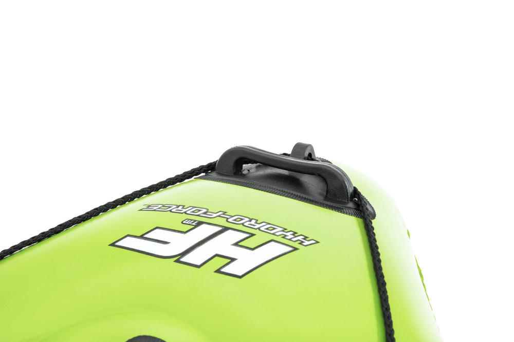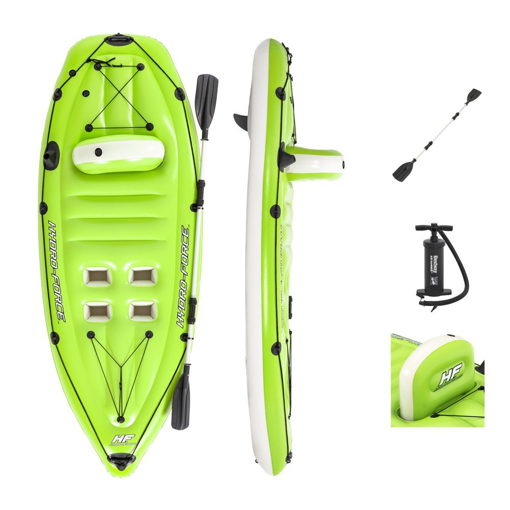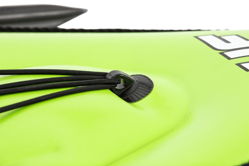 Ein Ausflug ans Wasser ist eine ideale Form der Freizeitgestaltung. Um diese unbeschwerte Zeit abwechslungsreicher zu gestalten, statten Sie sich mit zusätzlichem Poolzubehör aus. Das Kajak ist zum Fischen auf dem Wasser bestimmt. Es ist auch perfekt für einen Erholungsausflug auf dem See oder im Schwimmbad. Es wurde aus strapazierfähigem, beschädigungsresistentem Vinyl hergestellt. Jetzt können Sie bequem angeln, komplett mit einem eingebauten Angelrutenhalter und Ruderschlössern. Das Kajak hat auch eine aufblasbare Rückenlehne für maximale Entspannung und 4 Fußstützen für Benutzer aller Größen. Ideal für Transport und kompakte Lagerung. Außerdem ist die Rückenflosse abnehmbar, was die Aufbewahrung dieses Kajaks noch einfacher macht. Dieses Kit enthält auch eine Air Hammer™ Handpumpe für einfaches, schnelles Aufblasen, ein Paddel und einen Reparaturflicken.