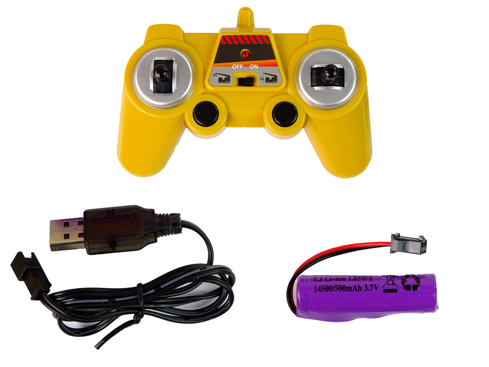 Die Fernsteuerung hat eine Frequenz von 2,4 Ghz, ihre Bedienung ist sehr einfach, zwei Joysticks ermöglichen ein bequemes Manövrieren. Mit ihrer Hilfe kann der Bediener das Fahrzeug lenken und die Richtungen vorwärts/rückwärts und rechts/links ändern. Es bewegt sich auf Gummirädern und hat LED-Lichter an der Vorderseite während der Fahrt. Das Modell ist im Maßstab 1:26 gefertigt und mit schwarzen Details sowie auffälligen Aufklebern versehen. Der Kranhaken wird per Fernsteuerung abgesenkt und angehoben. Die Drehung der Kabine hingegen wird manuell gesteuert.