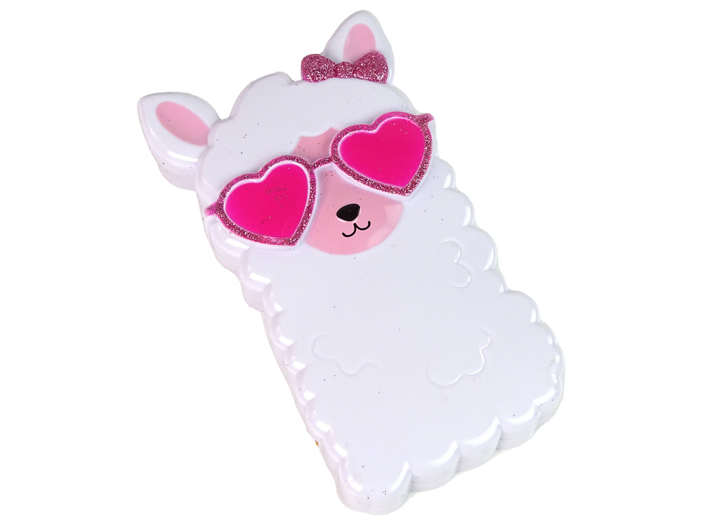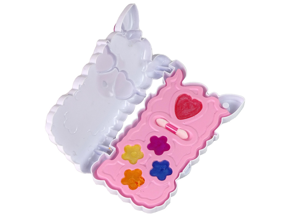 Die wunderbar zusammenklappbare Make-up-Palette birgt beim Öffnen viele Schätze. Sie besteht aus vier Glossen in verschiedenen Farbtönen, die in der Form einer Lama-Silhouette angeordnet sind. Aus den Lidschatten kann das Mädchen wählen, wie es sich heute für einen kleinen Ausflug schminken will. Die Schminktasche passt problemlos in eine kleine Handtasche oder einen Rucksack.