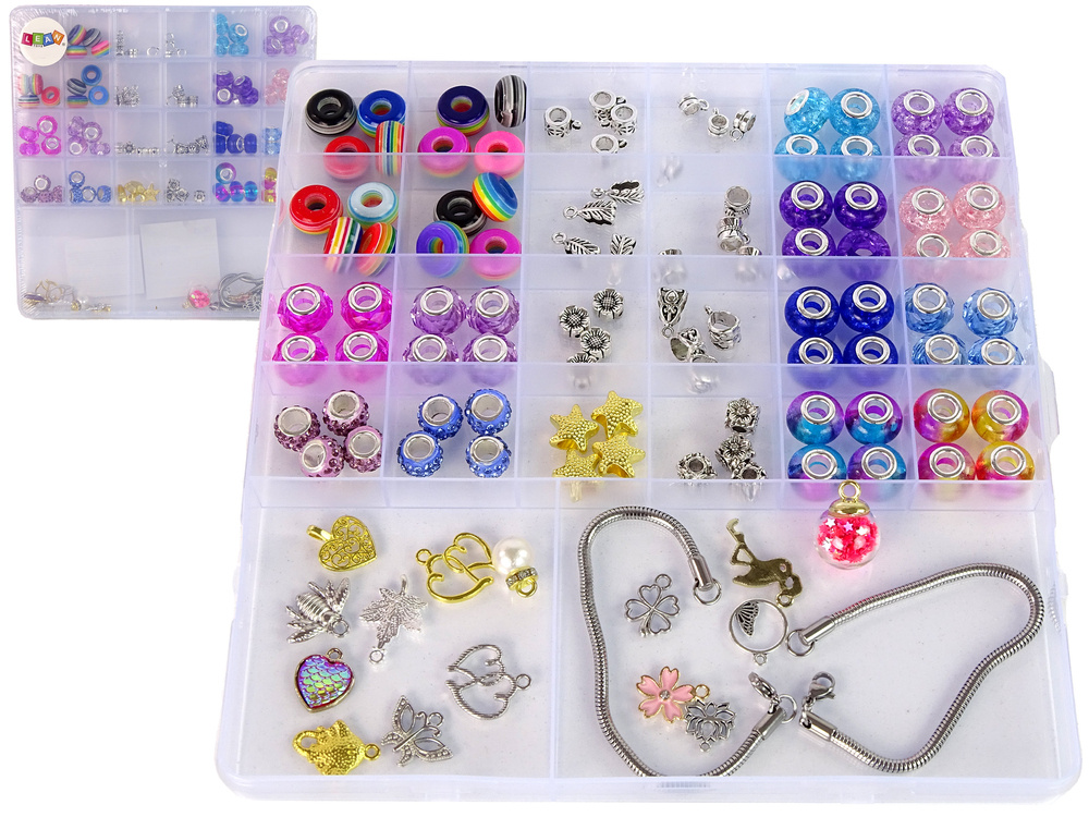 Das Set enthält alles, was zur Herstellung von Schmuck benötigt wird. Der große Organizer enthält 16 Modelle von Perlen in verschiedenen Farben und verschiedene Arten von Anhängern - Blätter, Seesterne, Blumen, Herzen. Da findet jeder seinen Favoriten!