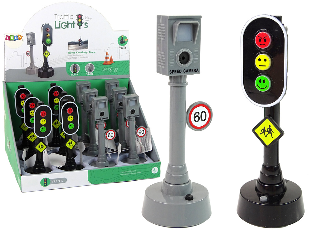 Die Ampeln sind schwarz und haben kleine Gesichter aufgemalt, um die Möglichkeit zu symbolisieren, einen Fußgängerüberweg zu überqueren (wütend bei Rot, wartend bei Gelb, lächelnd bei Grünlicht). Durch Drücken eines Knopfes wird die Ampel eingeschaltet. Der Blitzer mit einem 60-km-Geschwindigkeitsbegrenzungsschild ist grau und verfügt über Licht- und Soundeffekte, die die tatsächliche Aufnahme von Fotos imitieren.