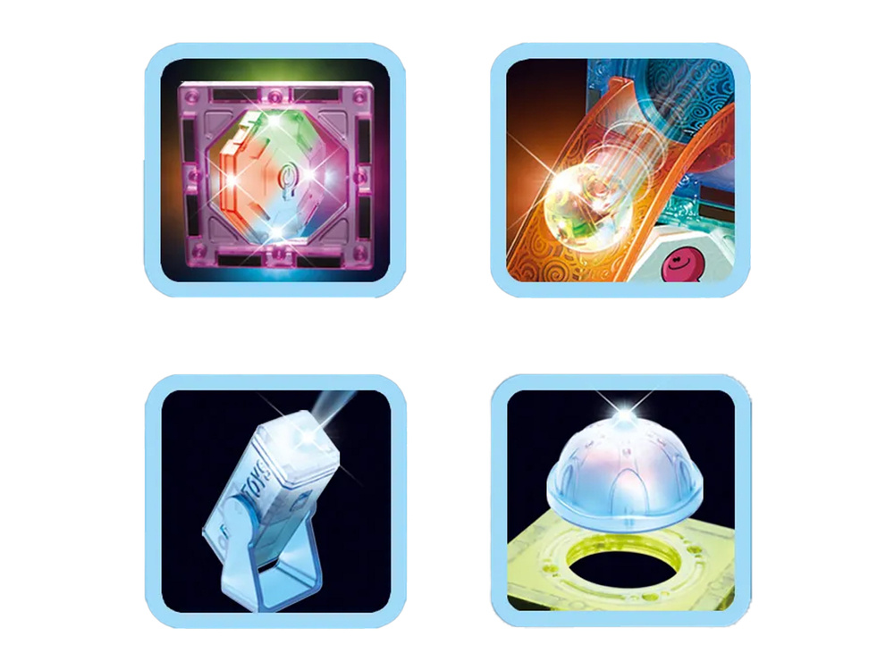 Die Rutsche besteht aus mehreren miteinander verbundenen magnetischen Elementen, auf denen die leuchtenden Kugeln rutschen. Einige der Elemente der Bahn sind mit LEDs ausgestattet, ebenso wie kleine Scheinwerfer, die an der Seite der Bahn angebracht werden können, um sie zu beleuchten. Die Beleuchtung sorgt für noch mehr Spaß und Attraktivität. Es liegt eine Bauanleitung bei, die Beispiele für den Aufbau zeigt.