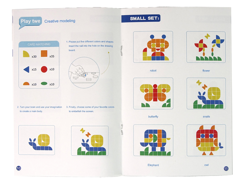 Das gesamte Set besteht aus 112 Teilen. Im Inneren finden sie eine Reihe von kleinen Blöcken in verschiedenen geometrischen Formen. Sie können sie ganz einfach an der Tafel befestigen und damit ein Muster erstellen. Das im Set enthaltene Heft zeigt Beispielbilder.