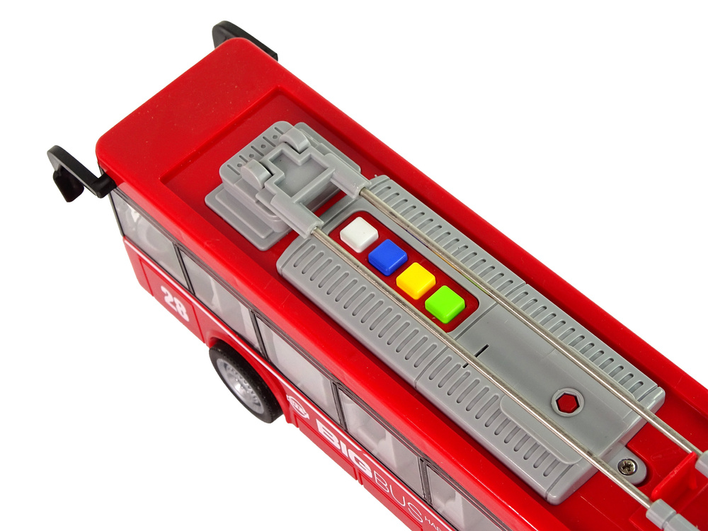 Der rote Bus ist doppelt, hat bewegliche Teile und angetriebene Hinterräder. All diese Eigenschaften machen den Bus noch realistischer und regen zum Spielen an. Der Bus hat die Möglichkeit, alle Türen zu öffnen, genau wie bei einem echten Bus. Die Türen lassen sich mit den Knöpfen an der linken oberen Seite öffnen. Außerdem hat der Bus bunte Knöpfe, die, wenn sie nacheinander gedrückt werden, charakteristische Geräusche verursachen. Auf dem Dach des Busses sind zwei Elemente angebracht, die angehoben werden können. Die Hinterräder des Fahrzeugs sind angetrieben, so dass der Bus eine gewisse Strecke selbständig fahren kann, ohne zu schieben.