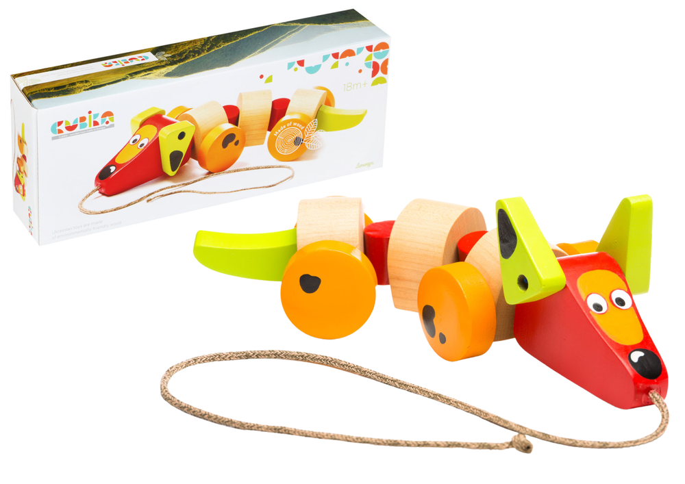 Holzspielzeug "Dackel" zum Ziehen, für die Kleinsten gedacht. Es hat einen beweglichen Rumpf und Räder und eine 55 cm lange Schnur zum Ziehen. Das Spielzeug ist in fröhlichen Farben gehalten und regt das Kind zur Interaktion an.