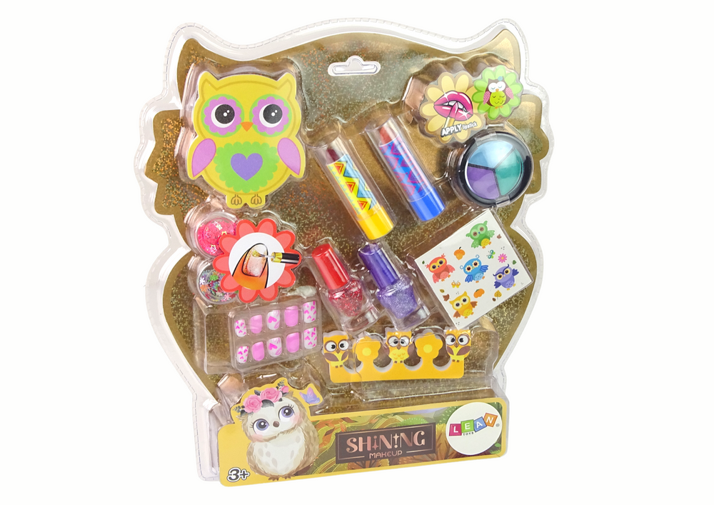- Kreatives Set aus Make-up und Nagelkunst mit Lippenstiften, Eulen-Nagelfeile, Aufklebern, Glitzerlacken, Schatten und Pailletten. Kreieren Sie zauberhafte Stilisierungen! Verpackung: 28 cm x 32 cm x 4 cm.
