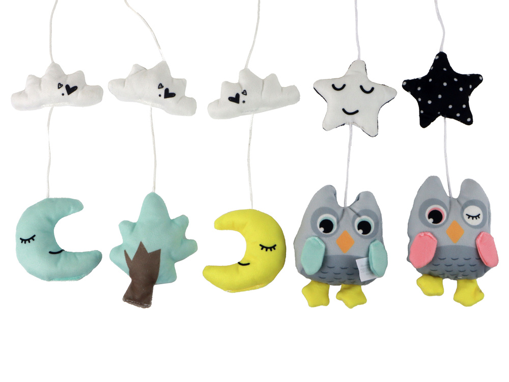 Das Set enthält fünf Schnüre mit plüschigen, bunten Maskottchen: Monde, Wolken, Sterne, Eulen. Jeder von ihnen fühlt sich weich an und ist kinderfreundlich. Sie haben leuchtende, intensive Farben, die die Aufmerksamkeit des Kleinkindes auf sich ziehen und seine sensorische Entwicklung anregen. Darüber hinaus spielt die im Set enthaltene Spieluhr freundliche Melodien und bringt das gesamte Karussell in Rotation. Es ist die perfekte Lösung, um Ihr Baby jederzeit und überall zu unterhalten und zu stimulieren.