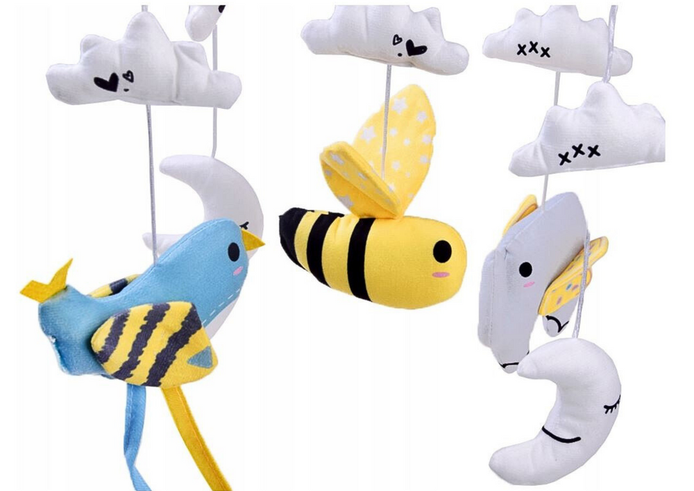 Ein Babybett-Mobile mit Plüschwolken ist das perfekte Spielzeug für ein Baby. Das Motiv des Karussells sind fröhliche Wolken, der Mond und bunte Tiere, das Baby wird es bestimmt mögen, und die sanfte Bewegung und die ruhige Schlafliedmelodie werden beruhigend wirken und das Einschlafen erleichtern.