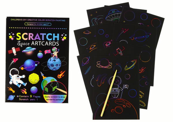 Im Set finden Sie 9 Bilder zum Kratzen, die vor den Augen des Kindes zum Leben erwachen. Der Spaß ist einfach: Mit einem speziellen Holzstab können Sie die schwarze Schicht auf dem Bild abkratzen und so wunderschöne und farbenfrohe Illustrationen zum Vorschein bringen. Diese Illustrationen zeigen verschiedene Szenen aus dem Weltraum.
