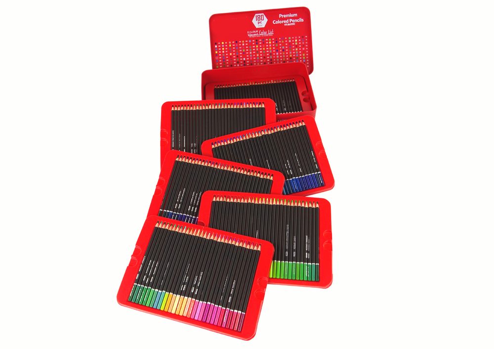 - Ein Set mit 180 Buntstiften in einem Metallbehälter mit verschiedenen Farben. 12 Metallic-Stifte sorgen für Effekte. Nummerierungs- und Farbkarten zum Nachverfolgen der Inspiration. Ein stabiler, mehrstufiger Behälter. Praktischer Karton.