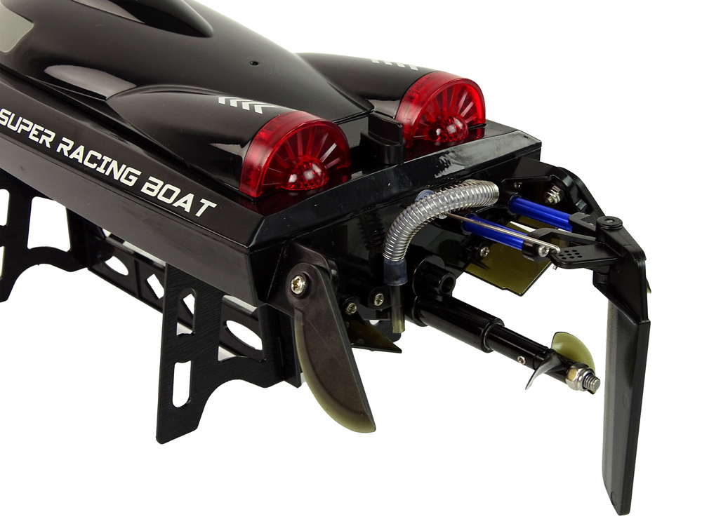 - Realistisches RC-Motorboot, schwarz, 48 cm x 12 cm x 9,5 cm, 55 km/h, 2,4 GHz, Akku, Fernbedienung, Überrollschutz. Beginnen Sie Ihr Abenteuer auf dem Wasser!