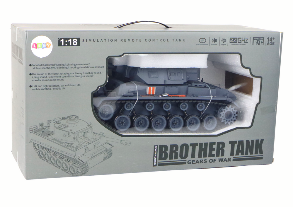 Die Steuerung des Tanks erfolgt über eine Fernbedienung, die eine vollständige Kontrolle über das Fahrzeug ermöglicht. Dank ihm können wir es vorwärts, rückwärts und seitwärts steuern und es sogar um 360 Grad drehen, was den Spaß abwechslungsreicher macht. Zusätzlich können wir Musik, Schussgeräusche und Rauch einschalten, was den Realismus des Spiels weiter erhöht.