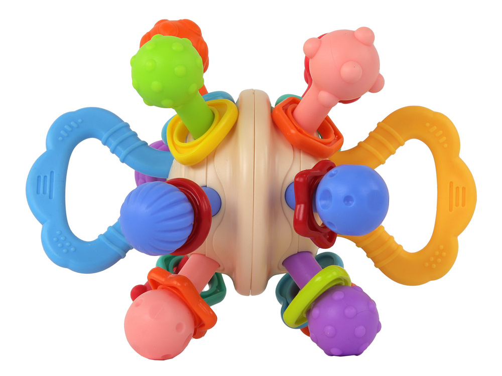 Die Oberfläche der Rassel ist mit Gummielementen in Form von Kugeln mit zarten Vorsprüngen und Perlen verziert, wodurch eine einzigartige Textur entsteht, die den Tastsinn des Babys anregt. Eine Vielzahl von Texturen hilft bei der Entwicklung sensorischer und kognitiver Fähigkeiten.