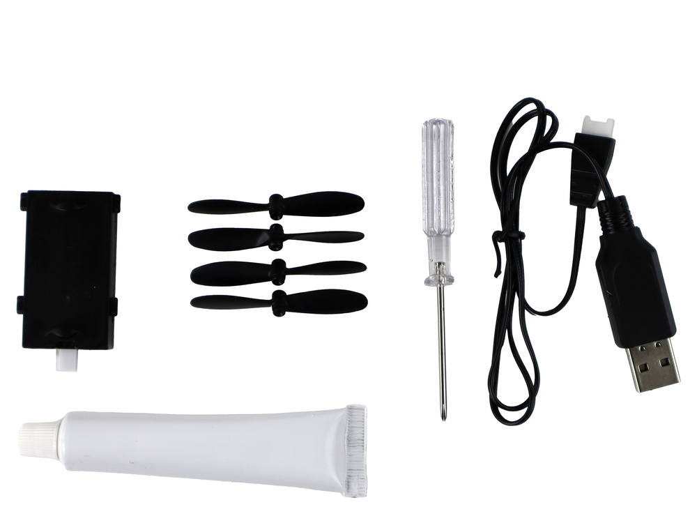 Im Set sind außerdem vier austauschbare Propeller, ein Ladekabel, ein Schraubendreher und Kleber enthalten.