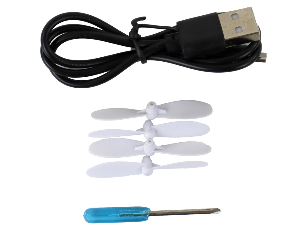 Im Set sind außerdem vier austauschbare Propeller und ein Ladekabel enthalten.