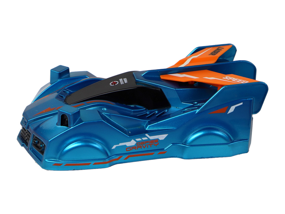 - Ein blaues Spielzeugauto, das dank der schwerkrafteliminierenden Technologie an Wänden und Decken fahren kann. Die Steuerung erfolgt über den mitgelieferten Laser.