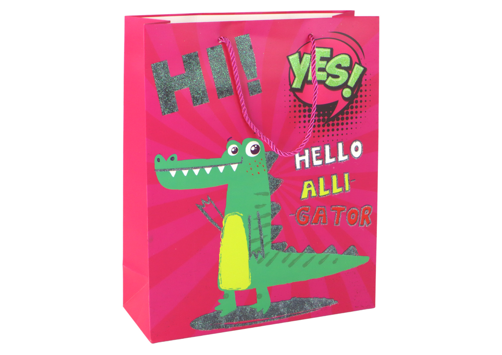 Das Krokodil-Motiv mit Glitzer entführt Sie in die Welt der Kinderträume. Egal zu welchem Anlass – Geburtstag oder Feiertag – unsere Geschenktüte macht jeden Moment noch besonderer.
