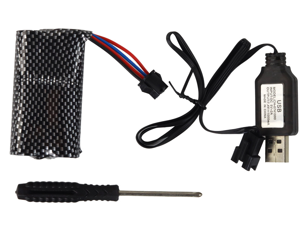 Betrieben wird die Pistole mit einer 7,4V-Batterie, die im Set enthalten ist. Das Original-Ladegerät ist im Lieferumfang des Akkus enthalten.