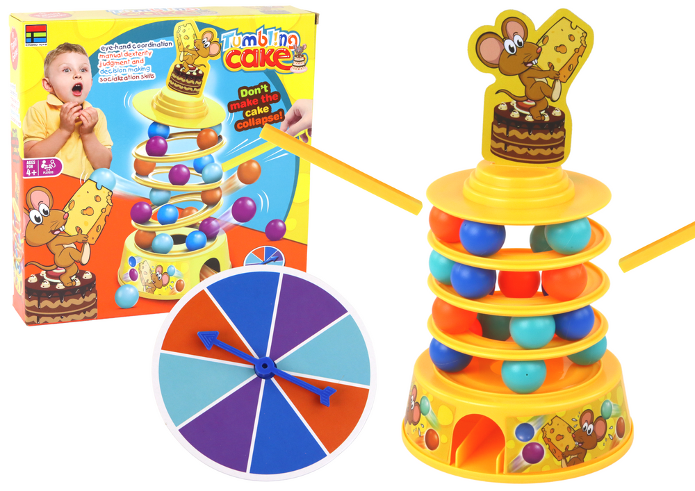 Zuerst bauen wir unseren Wackelturm zusammen. Wir werden eine Unterlage verwenden, auf der wir bunte Kugeln platzieren. Dann fügen wir weitere Schichten unseres Käsebergs und der Käsebällchen hinzu. Wir krönen den Turm mit einer Decke mit einer fröhlichen Maus. Bei dem Spiel geht es darum, einen Ball einer zuvor gezogenen Farbe in unseren Turm zu schieben. Die gesamte Struktur ist beweglich und instabil, daher ist es keine leichte Aufgabe. Wer den Turm umstößt und die Maus fallen lässt, hat verloren.