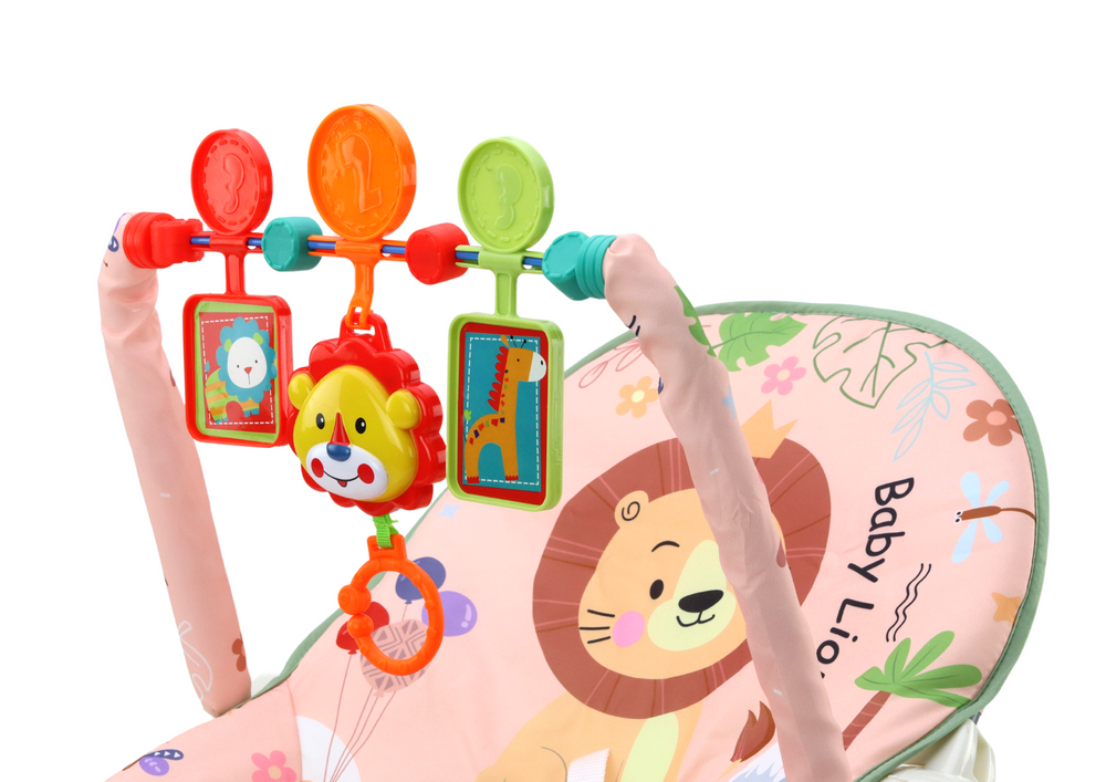Der rosafarbene Bezug der Wippe ist mit einem bezaubernden Motiv eines Löwen und verschiedener Insekten und Pflanzen verziert, was jeden darin verbrachten Moment voller Abenteuer und Freude macht. Zur Wippe gehört ein Haarreif mit drehbaren Anhängern, die niedliche Tiere darstellen: einen Löwen und eine Giraffe. Durch Ziehen am orangefarbenen Ring, der am Löwen befestigt ist, erklingen fröhliche Melodien, die das Kleinkind zusätzlich zum Interagieren und Entdecken anregen.