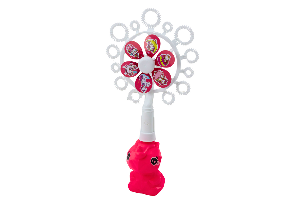 - Die Seifenblasenmaschine mit rosafarbenem Windrad und einhornförmigem Behälter ist ein bezauberndes Spielzeug, das bunte Seifenblasen erzeugt. Gießen Sie einfach die Flüssigkeit in die Schale, tauchen Sie den Ventilator ein und lassen Sie ihn rotieren.