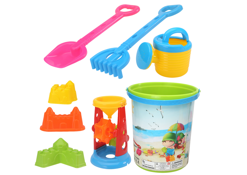 - Das Sandspielzeug-Set beinhaltet einen großen Eimer mit Strandbildern, eine Mühle, eine Schaufel, einen Rechen, drei Formen und eine Gießkanne. Sie sind farbenfroh und langlebig und ziehen die Aufmerksamkeit des Kindes auf sich, regen seine Fantasie an un