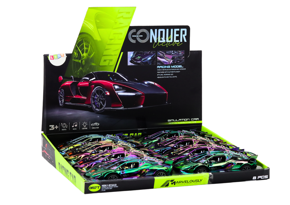 Dieser tolle Sportwagen ist der Traum eines jeden kleinen Autoliebhabers. Beeindruckend ist seine einzigartige Körperfarbe – es handelt sich um einen Chamäleonkörper, der je nach Beleuchtung und Betrachtungswinkel seine Farbe ändert. Es funkelt in Regenbogenfarben und schimmert mit subtilen Lichtreflexionen. Dieser Effekt erregt Aufmerksamkeit und lässt das Auto wie eine echte Maschine aus der Zukunft aussehen.